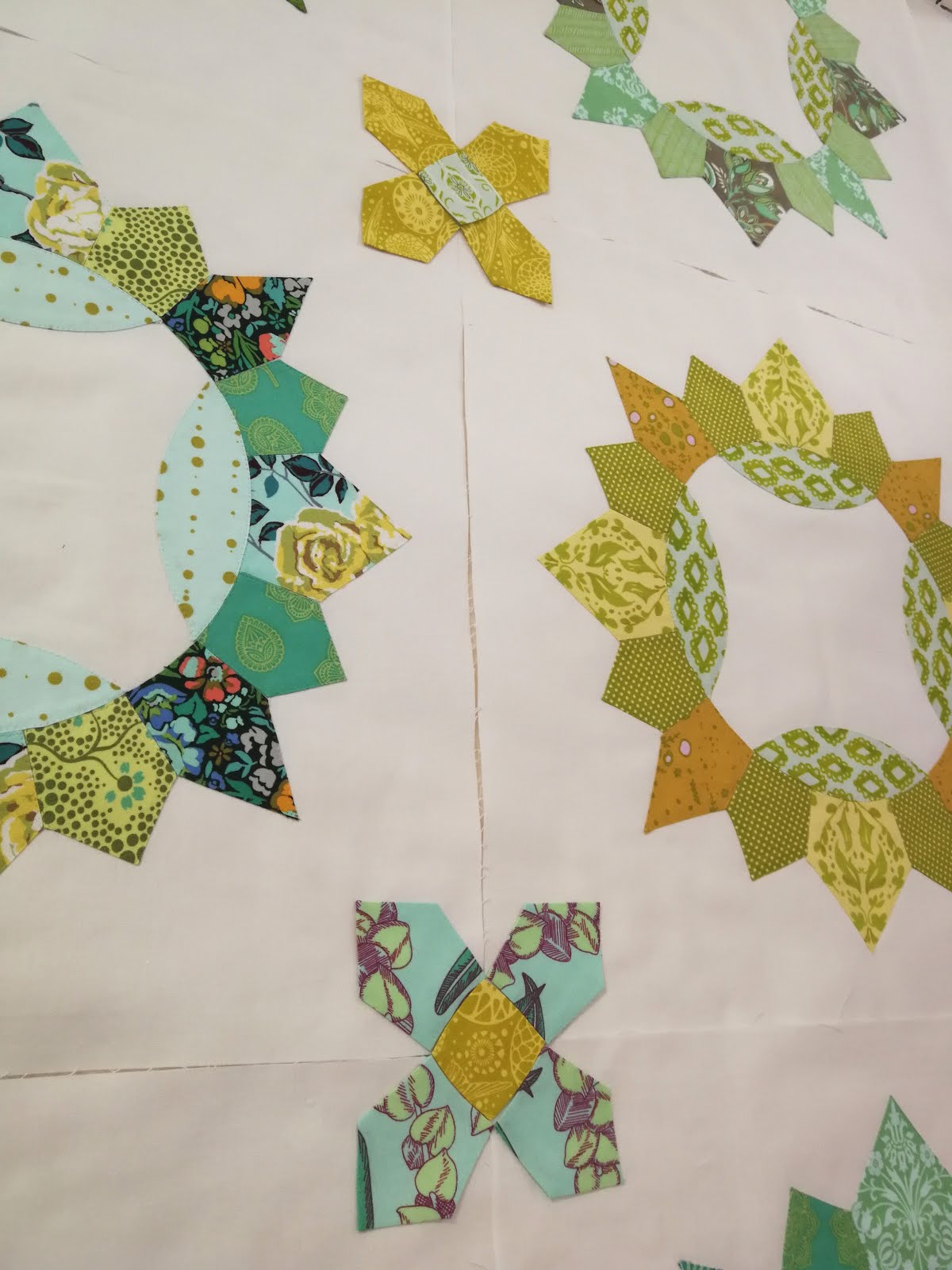 This is the third "green quilt" that I have in the making, and yet I would like each of them to have a different feel. For this quilt I've pulled in some patina green, and pale aquas, while my yellow stars applique quilt is more yellows and chartreuse green. But they are all planned for the same room, so there should be enough to still tie them to each other.
